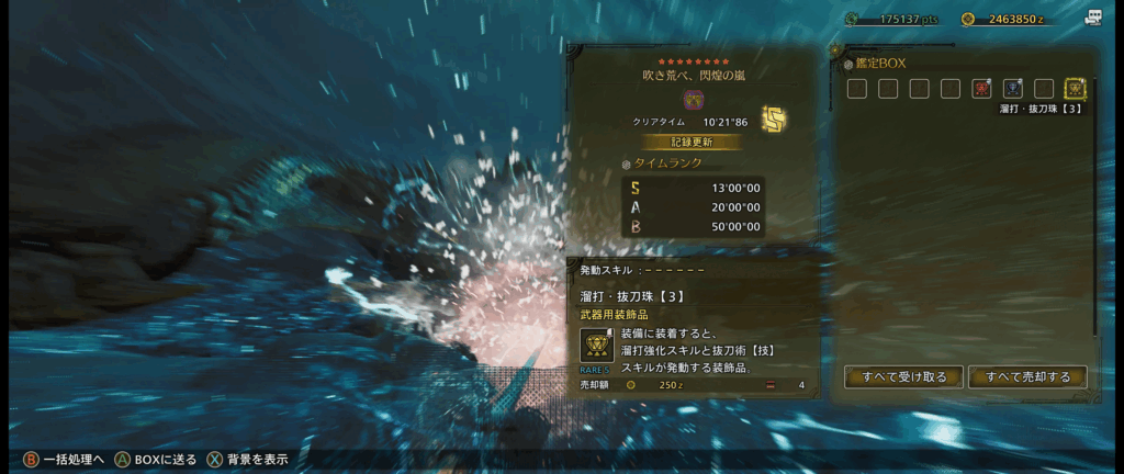 真面目に詰めるほど気合が乗らないんで、やればSランク報酬もらえるなら、やるかあ……くらいの気合でやりました。ライトボウガンだと上手い人でも6分とかなんで、僕にしては頑張ったでしょうと思います。